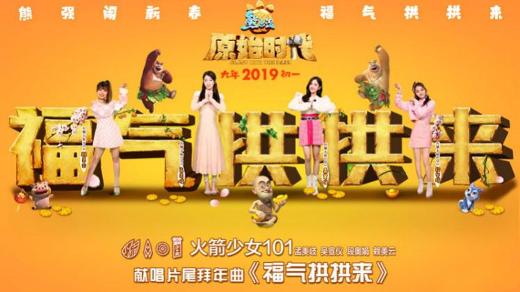 1月16日,新生代女子團體火箭少女101與最強口碑賀歲動畫電影《熊出沒?原始時代》強強聯(lián)合,由火箭少女101成員孟美岐、吳宣儀、段奧娟、賴美云合體獻(xiàn)聲的電影片尾曲《福氣拱拱來》在酷狗音樂正式上線。看火箭少女帶領(lǐng)大家一起元氣滿滿喜迎2019新年到!