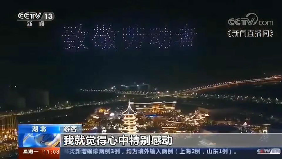 據央視新聞頻道報道,荊州方特的“無人機光影秀吸引了不少游客前來打卡”,有游客在現場接受采訪時表示,這場活動“很好看,而且也特別感人,特別是出現‘荊州你好’,‘愛湖北,愛荊州’等字眼,就覺得心中特別感動”。