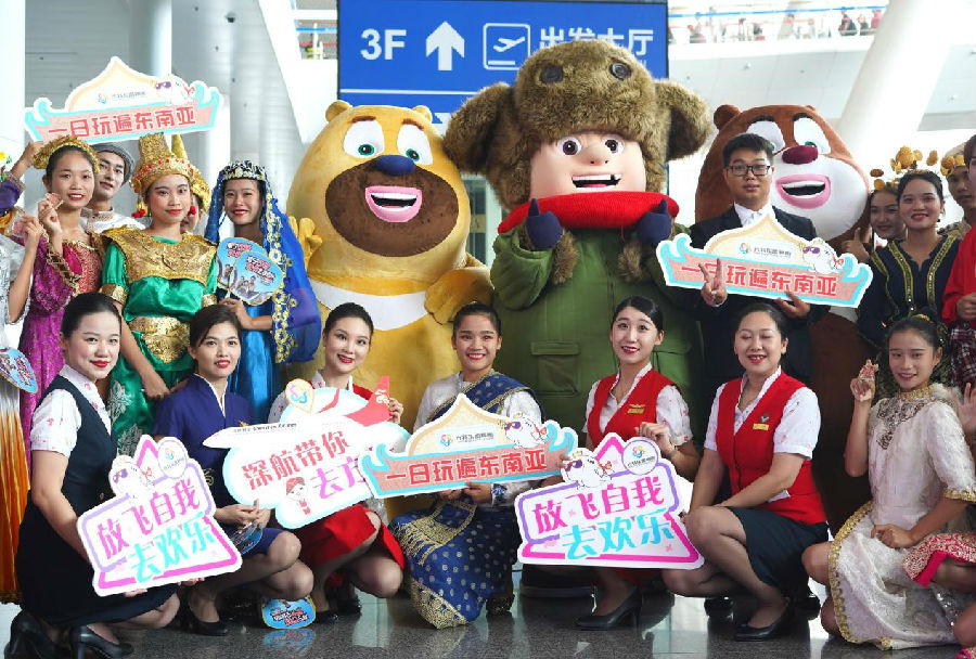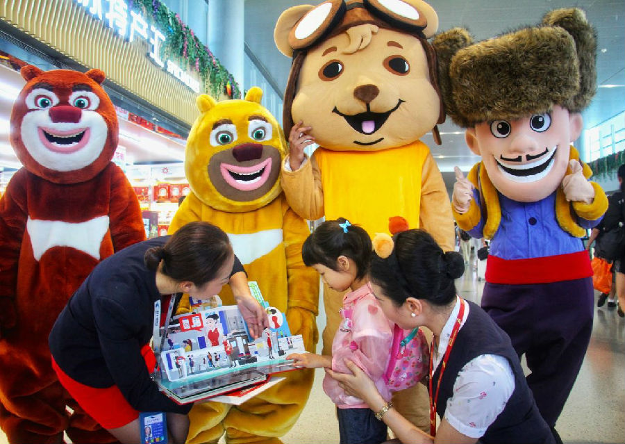 此次暑期聯(lián)合活動(dòng)在南京祿口機(jī)場(chǎng)和南寧吳圩機(jī)場(chǎng)同時(shí)舉行。在活動(dòng)現(xiàn)場(chǎng),深航的值機(jī)柜臺(tái)和行李區(qū)被裝飾一新,隨處可見(jiàn)方特主題樂(lè)園的夢(mèng)幻城堡、過(guò)山車、“熊出沒(méi)”等元素。來(lái)自南寧方特東盟神畫的專業(yè)演員帶來(lái)極具異域風(fēng)情的東盟舞蹈,蕪湖方特東方神畫的專業(yè)演員則扮演了經(jīng)典的古裝IP人物,以快閃舞蹈的形式為廣大旅客現(xiàn)場(chǎng)獻(xiàn)上了精彩的表演。